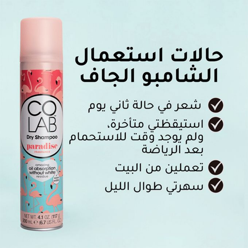 - This amazing formula uses very small particles that absorb excess oil and grease from the scalp, meaning less product is sprayed onto the hair. With COLAB, no water is needed at all, so it's the perfect choice for quick and on-the-go hair refreshment! Just spray, massage and style!