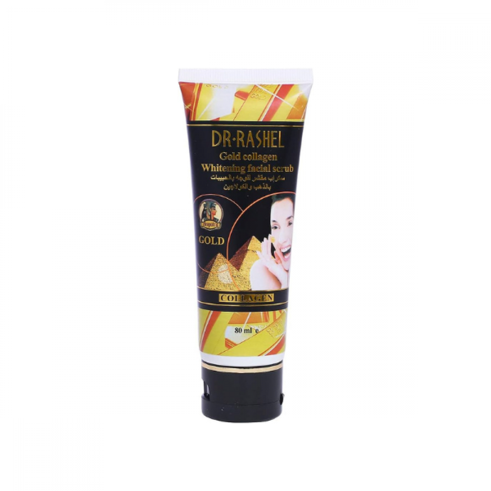 the description: Dr. Rachel skin scrub with gold extract 80 ml. Specifications: • Exfoliates dead skin and revitalizes skin cells. • Get a great result within 30 seconds. • Suitable for all skin types.